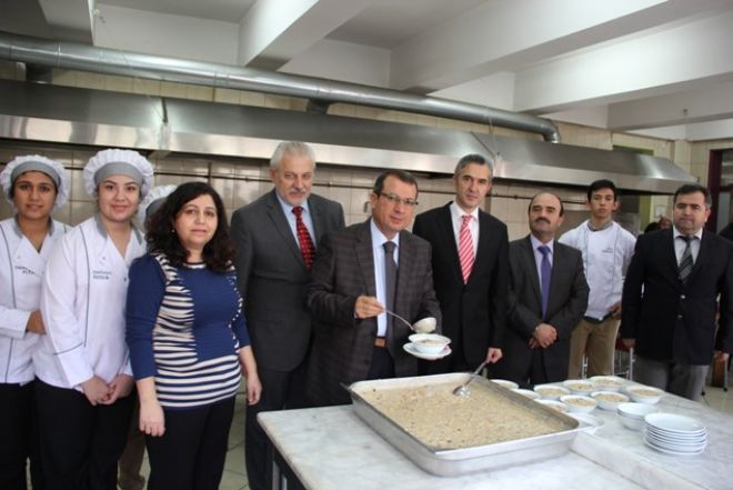 Okul Müdürü Önder Erdurmuş, ev sahibi olarak konuklarını karşıladı. Öğretmenler odasında hazırlanan masada yiyecek içecek hizmetleri alanı 11. sınıf öğrencileri tarafından davetlilere aşure ikram edildi.