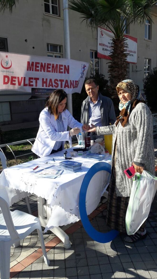 14 Kasım Dünya Diyabet Günü sebebiyle Menemen Cumhuriyet Meydanı´nda farkındalığı arttırmak ve bilgilendirmek amacıyla Menemen Devlet Hastanesi tarafından stand kuruldu. Diyabet Hemşiresi Kübra Görücü ve İç Hastalıkları Uzmanı Dr. Ziya Deniz tarafından vatandaşlara diyabet ile ilgili bilgilendirmeler yapılarak broşürler dağıtıldı. Standı ziyaret edenlerin kan şekeri ölçümleri yapıldı. Ücretsiz kan şekeri ölçümüne ilgi büyüktü. Kan şekeri yüksek olanlar dahiliye polikliniklerine yönlendirmeleri yapıldı.