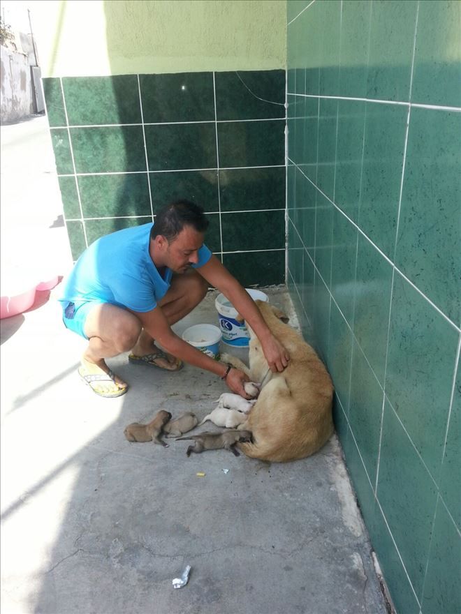 Hayatta kalan 6 yavrusuyla yaşam savaşı veren sokak köpeğine mahallede yaşayan Harun Güneşsoy yardım eli uzattı.