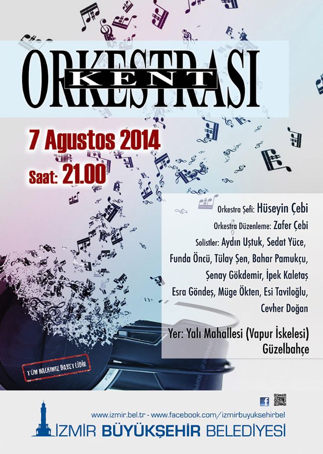 Ağustos ayının ilk haftasında İzmir Büyükşehir Belediyesi Kent Orkestrası da bir konser verecek. Şefliğini Hüseyin Çebi’nin yaptığı Kent Orkestrası’nın konseri 7 Ağustos 2014 Perşembe akşamı Güzelbahçe Yalı Mahallesi gece pazar yerinde gerçekleşecek. Saat 21.00’de başlayacak konserde Aydın Uştuk, Sedat Yüce, Funda Öncü, Tülay Şen, Bahar Pamukçu, Şenay Gömdemir, İpek Kaletaş, Ebra Göndeş, Müge Ökten, Esi Taviloğlu, Cevher Doğan solist olarak sahne alacak. Konserin orkestra düzenlemeleri ise Zafer Çebi’ye ait.