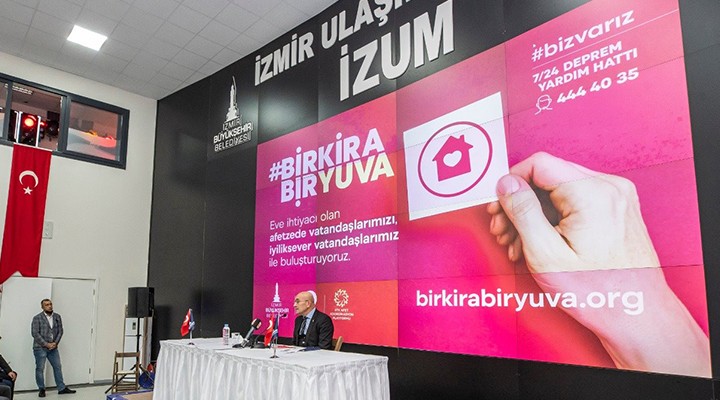 İzmir Büyükşehir Belediye Başkanı Tunç Soyer, depremin ardından ev ihtiyacı doğan afetzedelerle onlara destek olmak isteyenleri buluşturacak yeni bir kampanya başlattı. “Bir Kira Bir Yuva” adıyla hayata geçirilen dayanışma kampanyası için oluşturulan web sitesi üzerinden kira desteği vermek ya da boş durumdaki evini kullanıma açmak isteyenler bildirimde bulunacak. İzmir Büyükşehir Belediyesi ise evsiz kalan yurttaşların talepleri ile kampanyaya destek sunanları bir araya getirecek.