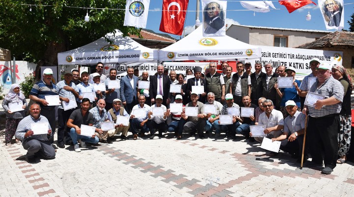 İzmir Orman Bölge Müdürlüğü tarafından düzenlenen "Gelir Getirici Tür Ağaçlandırması" projesi kapsamında Menemen’in İğnedere Mahallesi'nde 10 dekarlık bir alanda 2017 yılında dikilen 3 bin zeytin ağacı, 34 çiftçiye düzenlenen sertifika töreni ile dağıtıldı.