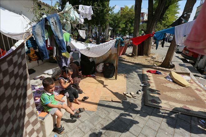 Çocuklarıyla geldikleri kentte parklar ve sokaklarda kalan Suriyeli aileler, güneşten korunmak için kıyafet ya da çarşaflarla yaptıkları tentelerle ilginç görüntüler oluşturuyor.
