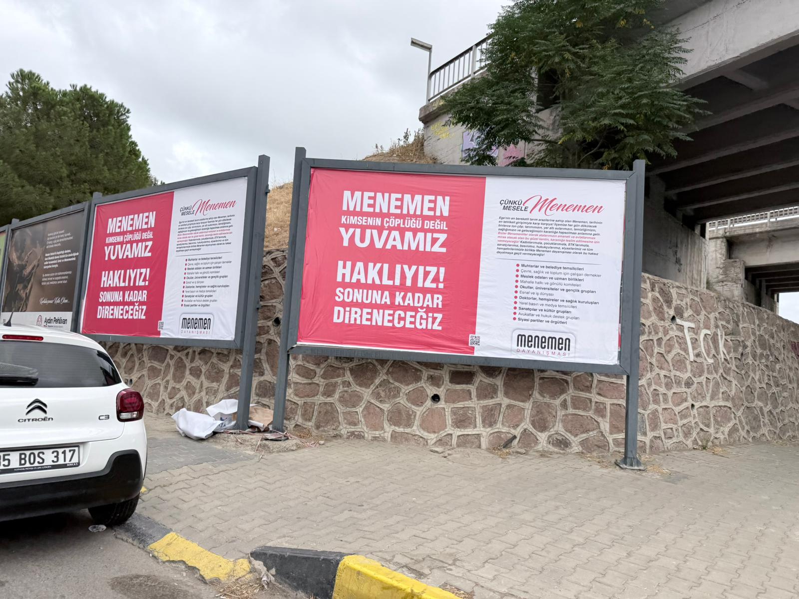 Menemen'in dört bir yanındaki reklam panolarına, "Menemen kimsenin çöplüğü değil! Yuvamız, haklıyız, sonuna kadar direneceğiz!" sloganıyla başlayan ve "Ege'nin en bereketli tarım arazilerine sahip olan Menemen, tarihinin en tehlikeli girişimiyle karşı karşıya! İlçemize her gün dökülecek binlerce ton çöp; tarımımızın, yer altı sularımızın, temizliğimizin, sağlığımızın ve geleceğimizin karanlığa hapsolması anlamına gelir. Bizler Menemenliler olarak atalarımızın emaneti ve evlatlarımıza miras olacak olan bu güzel kentin karanlığa teslim edilmesine izin vermeyeceğiz! Kadınlarımızla, çocuklarımızla, STK'larımızla, sanatçılarımız, basınımız, hukukçularımız, siyasilerimiz ve tüm hemşehrilerimizle birlikte Menemen dayanışması olarak bu haksız dayatmaya geçit vermeyeceğiz!" yazılı afişler asıldı. Tepkilere, Menemen Belediyesi ile birlikte muhtarlar, çevre sağlık ve toplum için çalışan dernekler, meslek odaları, ilçe halkı, gönüllü komiteleri, okullar, üniversiteler, öğrenci grupları, esnaf ve iş dünyası, doktor, hemşire ve sağlık kuruluşları, yerel basın ve medya temsilcileri, sanatçılar ve kültür grupları, avukatlar ve hukuk gruplarıyla siyasi parti temsilcileri destek verdi.