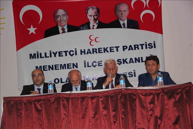 Kürsüye gelen MHP delegesi Murat Yazgan´ın yaptığı sunumun ardından saygı duruşu ve İstiklal Marşımız okundu. Kongreyi yönetmek için üyelerin önerileri ile Divan başkanlığına Şevket Alptekin, Divan üyeliklerine ise Fikret Öner, Bahattin Koyuncu ve Ömür Yetimoğlu önerildi ve oylamaya geçildi. Divan yerini aldı. Başkan Alptekin katılımcıları selamladı. Gündem gereği MHP Menemen İlçe Başkanlığının raporlarının okunması ve ibrasından sonra Başkan Alptekin MHP Menemen ilçe başkanlığına aday olacakların listesini istedi. İlçe başkanlığına aday olan Ali Rıza Bölük´e ait liste divana takdim edildi. Divana başka liste gelmeyince MHP ilçe başkan adayı, Yönetim Kurulu asil, Yönetim Kurulu yedek üyeleri ile il delegelerinin asil ve yedekleri tek tek okundu ve tanıtıldı.