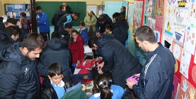 Teknik heyet ve futbolcular tarafından alınan hediyeler, tek göz odada kömür sobasıyla ısınarak ders yapan 14 Çavuşköylü çocuğun dünyasını renklendirdi.