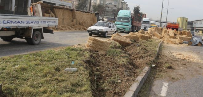 TIR kasasında bulunan saman balyaları orta refüje ve yola saçılırken, yolun İzmir – Aliağa yönü trafiğe kısa süreliğine kapandı.