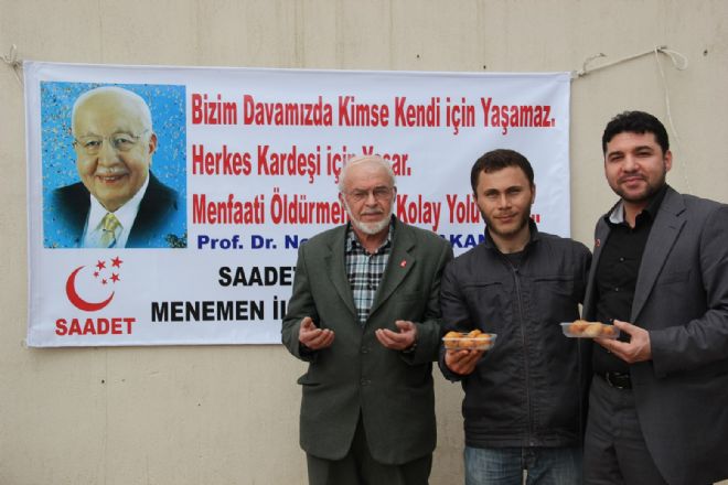 Menemen Saadet Partisi İlçe Başkanı Servet Yıldız yaptığı açıklamasında, “Milli Görüşün bu ülkedeki temsiliyetinin başlangıcını veren 54’üncü hükümetimizin de başbakanı olan Prof. Dr. Necmettin Erbakan hocamızın vefatının 4’üncü seneyi devriyesinin hayırla hasenatla anılması için bugün lokma döktürme hayratını ilçe başkanlığı olarak tertipliyoruz. Parti olarak maneviyata önem verdiğimiz için vefat eden büyüklerimizi duayla anıyoruz. Rabbim inşallah kabul etsin” diye ifade etti.