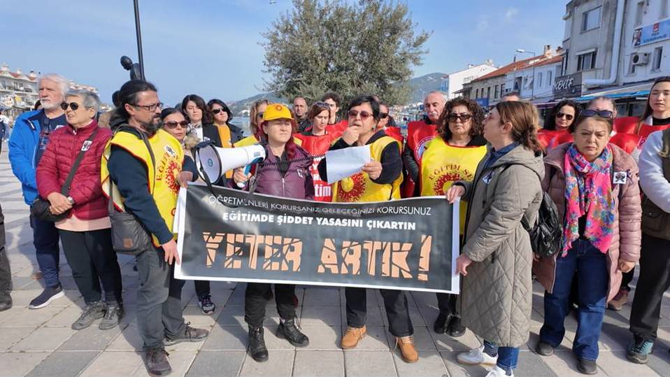 İzmir’in Foça İlçesi’nde Eğitim ve Bilim Emekçileri Sendikası (Eğitim –Sen) öncülüğünde düzenlenen basın açıklamasında okullardaki şiddet protesto edildi. Bir gün önce İstanbul’da bir meslektaşlarının okulda bıçaklı saldırıda hayatını kaybettiğini hatırlatan öğretmenler, okul güvenliği konusunda bütünlüklü, bilimsel ve katılımcı bir politikanın derhal hayata geçirilmesini istediler.