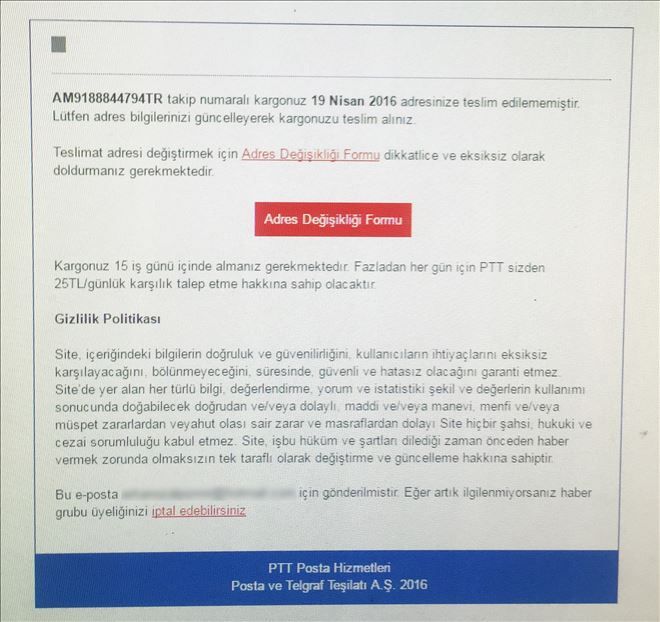 Özellikle son iki haftadır asılsız PTT gönderilerinden vatandaşlar şikayetçi. Edinilen bilgilere göre; PTT kargo, kurye veya kayıtlı mektubunuz var ibaresi ile mail alan vatandaşlar PTT´ye başvurmaya başladı. Bu konuda PTT´nin mail atma işleminin olmadığı, SMS ile bilgilendirmede bulunulduğu, bunun da cep telefonu verildiği taktirde gerçekleştiği şeklinde vatandaşlar uyarılmakta. PTT´den bir şey beklemiyorsanız bu maili tıklamayın yoksa bilgisayarınız çökebilir sözleriyle vatandaşlar ikaz edildi.