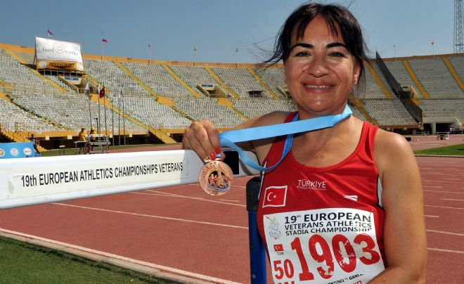 Avrupa Veteranlar Atletizm Şampiyonası 50-54 Yaş Bayanlar 300 Metre Engelli'de Türkiye'nin ilk madalyası, İzmir Büyükşehir Belediyesi Gençlik ve Spor Şube Müdürü Ganime Nalbantoğlu'ndan geldi.
