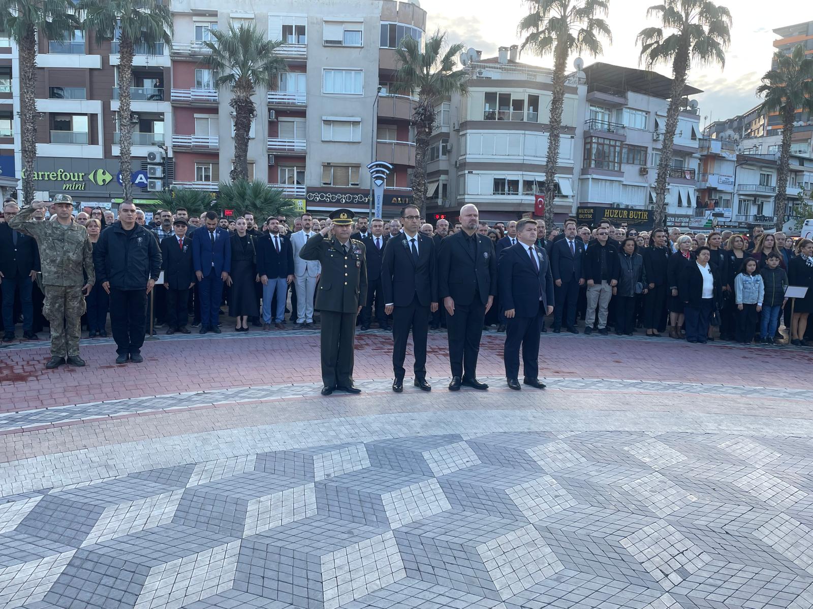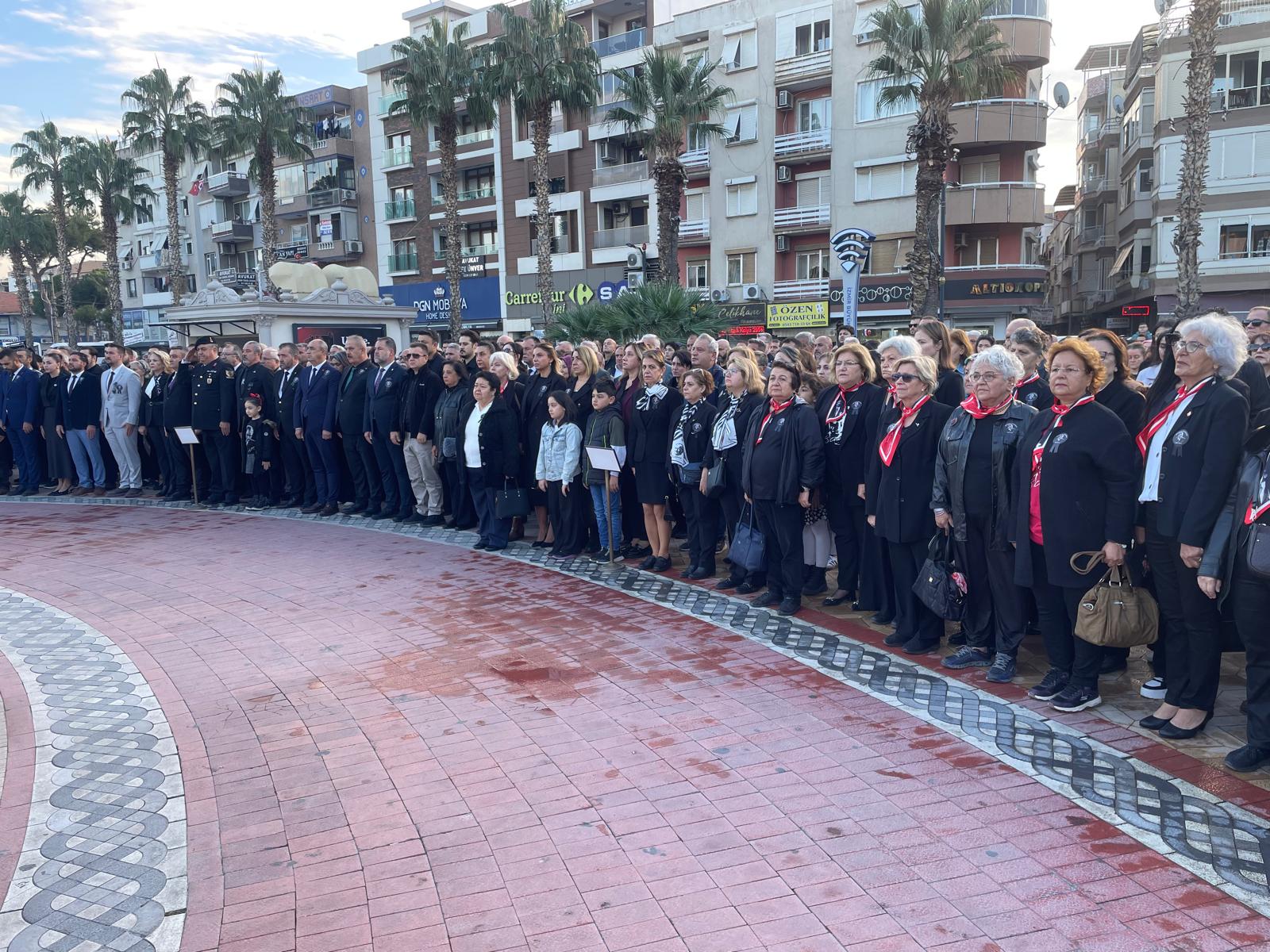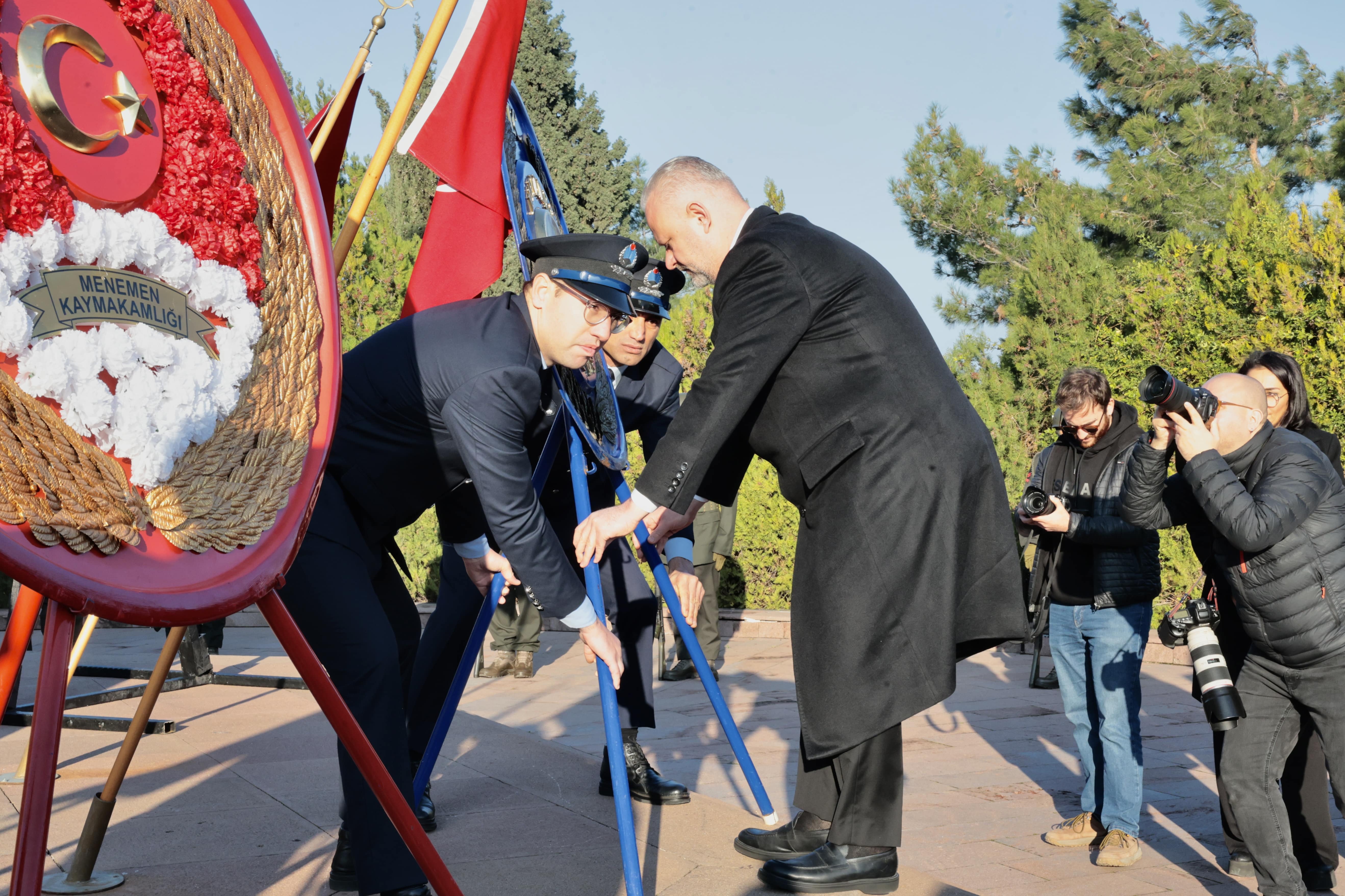Türkiye Cumhuriyeti’nin kurucusu Ulu Önder Mustafa Kemal Atatürk’ün sonsuzluğa uğurlanışının 87. yıl dönümünde düzenlenen 10 Kasım Anma Programı etkinlikleri kapsamında ilk tören Menemen Cumhuriyet Meydan’ında gerçekleştirildi. Kaymakamlık, Belediye, Garnizon Komutanlıpı çelenklerinin sunumu ile başlayan anma programına Menemen Kaymakamı Vedat Yılmaz, Menemen Belediye Başkanı Aydın Pehlivan, Garnizon Komutanı Topçu Albay Zekeriya Tosun, Menemen Cumhuriyet Başsavcısı Hüseyin Kaçar, kamu kurum ve kuruluşlarının daire amirleri, askerî erkan, gaziler, siyasi partilerin başkan ve yöneticileri, oda başkanları, sivil toplum kuruluşları, gaziler, okul müdürleri, öğretmenler, öğrenciler ve vatandaşlar katıldı. Saatler 09.05’i gösterdiğinde tüm Menemen’de hayat iki dakikalığına durdu. Kentin dört bir yanını saran siren seslerine sürücüler araçlarından inerek kornalarıyla eşlik etti. Saygı duruşu ve İstiklal Marşı’nın okunmasının ardından Menemen Cumhuriyet Meydan’ında yapılan çelenk sunum töreni son buldu.